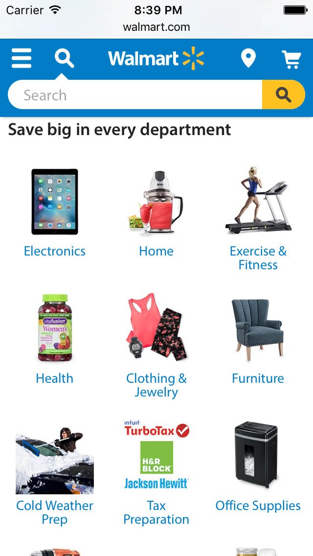 Choosing any one of the displayed categories here at Walmart will not take you to that product category – instead, it will send you to a special page with “On Sale” items of that product type. The “Save big in every department” header does imply this, but during testing we often observe users overlooking such “scope” headers.