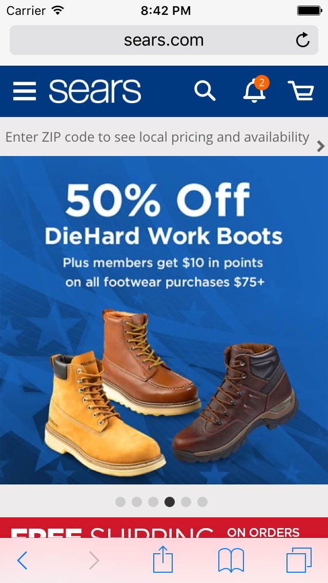 A comparison of Sears’ desktop and mobile homepage. Notice how the main navigation is collapsed on the mobile site, making the user much more likely to rely on the homepage content to establish their perception of the site’s product catalog.