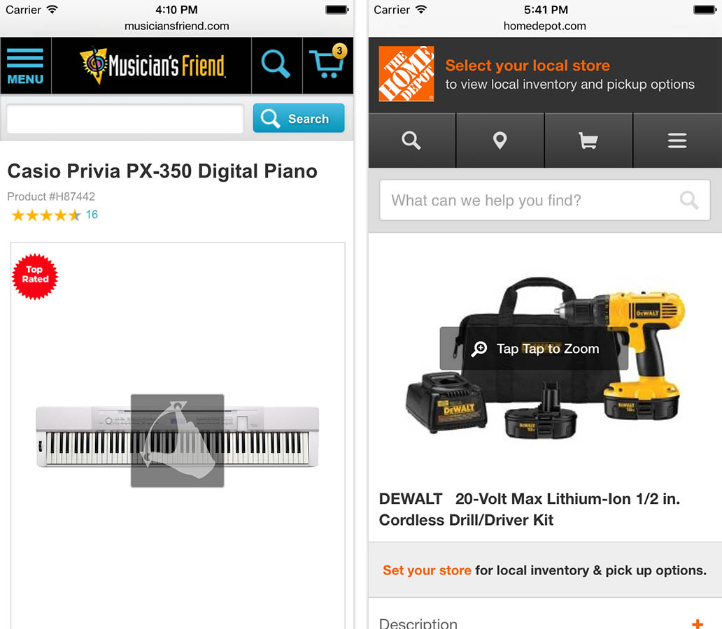Users are made aware that they can zoom images via (the otherwise hidden) gesture features at Musician’s Friend and Home Depot – it’s only 50% of the sites that support zoom gestures that also inform their users.