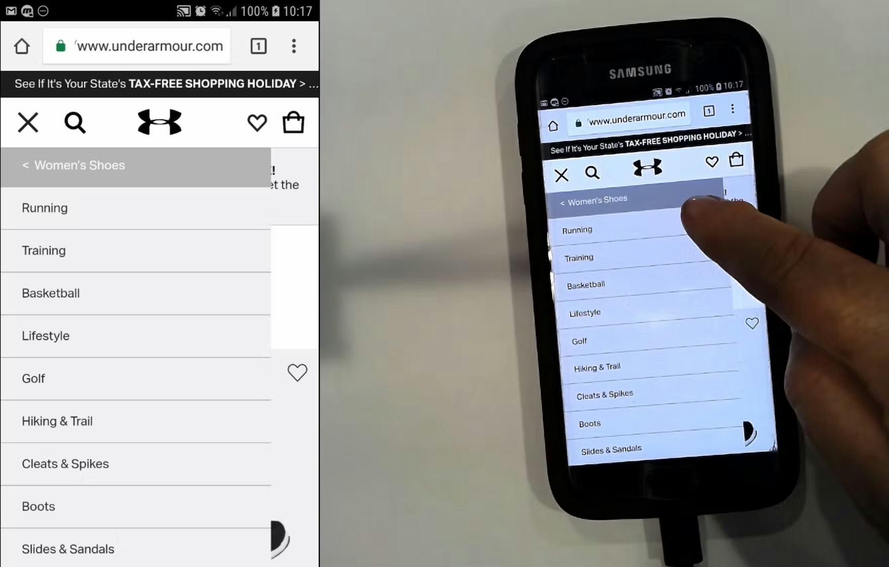 “Now on this one there isn’t an option to…Oh yeah it does at the very end, ‘Shop All Women’s Shoes’. I would prefer the ‘Shop All’ to be at the top…so I could click that link immediately if I want to because I’m not 100% sure what I want.” A participant initially assumed there’s no “Shop All” option in the “Women’s Shoes” category at Under Armour (first image), but stumbled on it after scrolling the menu (second image). Placing the “Shop All” option at the bottom of the menu makes it unnecessarily difficult for users to find.