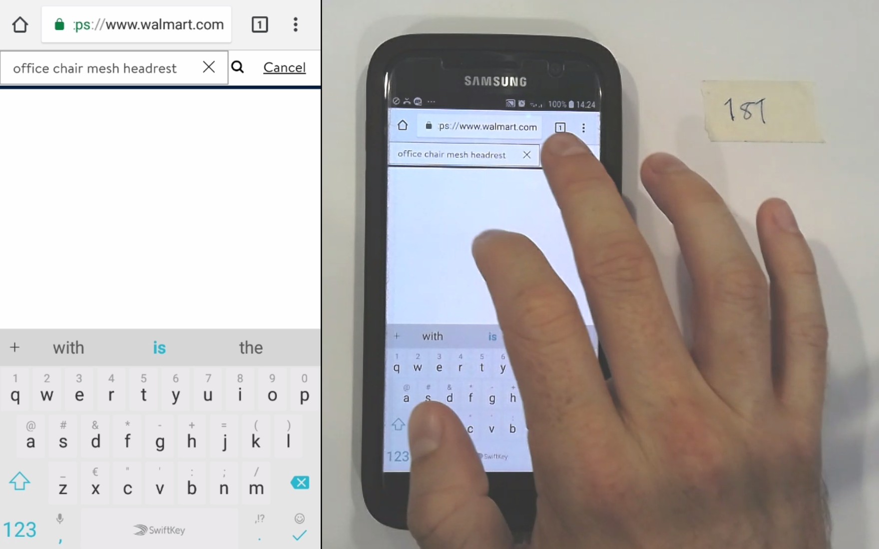 After initially using autocomplete to search for “office chair” at Walmart, a user revised his query to narrow the results — adding “mesh headrest”. He then hovered over the right side of the search field, and quickly found and tapped the magnifying glass icon for the first time.