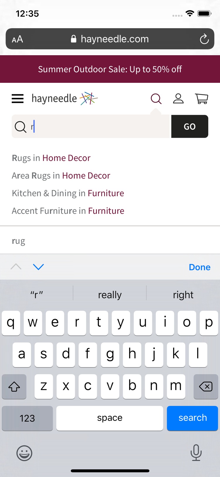 At Hayneedle, a “Go” button is provided directly in the UI, and the iOS touch keyboard invoked displays a blue “search” button, ensuring users notice and understand its purpose.