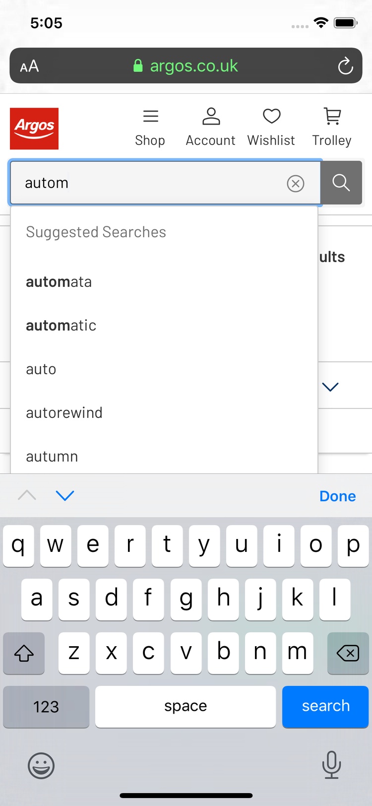 Similarly, at Argos, an explicit magnifying glass icon is positioned adjacent to the search field, and the custom “search” submit button in the keyboard provides a strong visual call to action.
