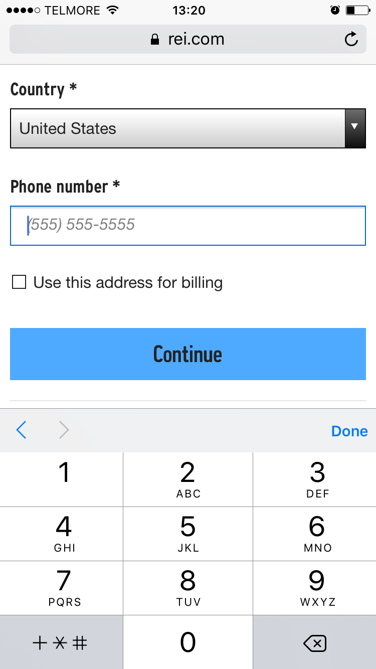 It’s of course crucial to provide formatting examples that users can actually type. Note how it’s impossible for the user to follow the phone formatting example at REI as the phone-optimized keyboard on iOS doesn’t allow entry of dashes or parentheses.