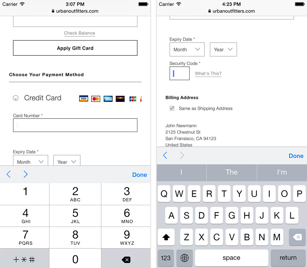 Purpose-built keyboards should be invoked consistently for all inputs on the same page, unlike the above example from Urban Outfitters, where a numeric keyboard is invoked for the credit card number but not for the security code field even though both values are always supposed to be numeric.