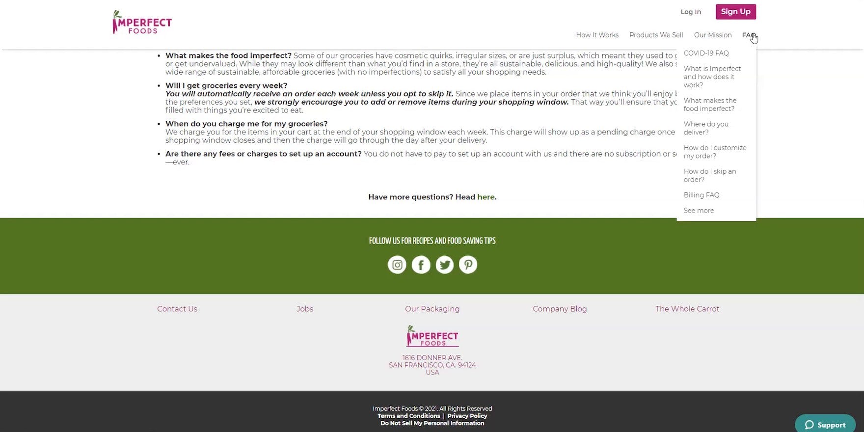 “So, I would have probably [abandoned] this website by now because I’d be like, ‘Where the hell is the pricing?’ If you’re hiding it from me [or] it’s not super easy to find, then why would I sign up? And that also suggests [the price is] high. In general, I wanna at least have an idea of what I’m paying. I don’t even care if it’s [an estimate].” At Imperfect Foods, users struggled to find pricing information — as it wasn’t included on any on major pages until the checkout flow — and thus had to resort to searching the embedded FAQs at the bottom of the “How It Works” page (first image), as well as the full FAQ section (second image). As a direct result of being unable to find subscription-service pricing information, this user abandoned the site.