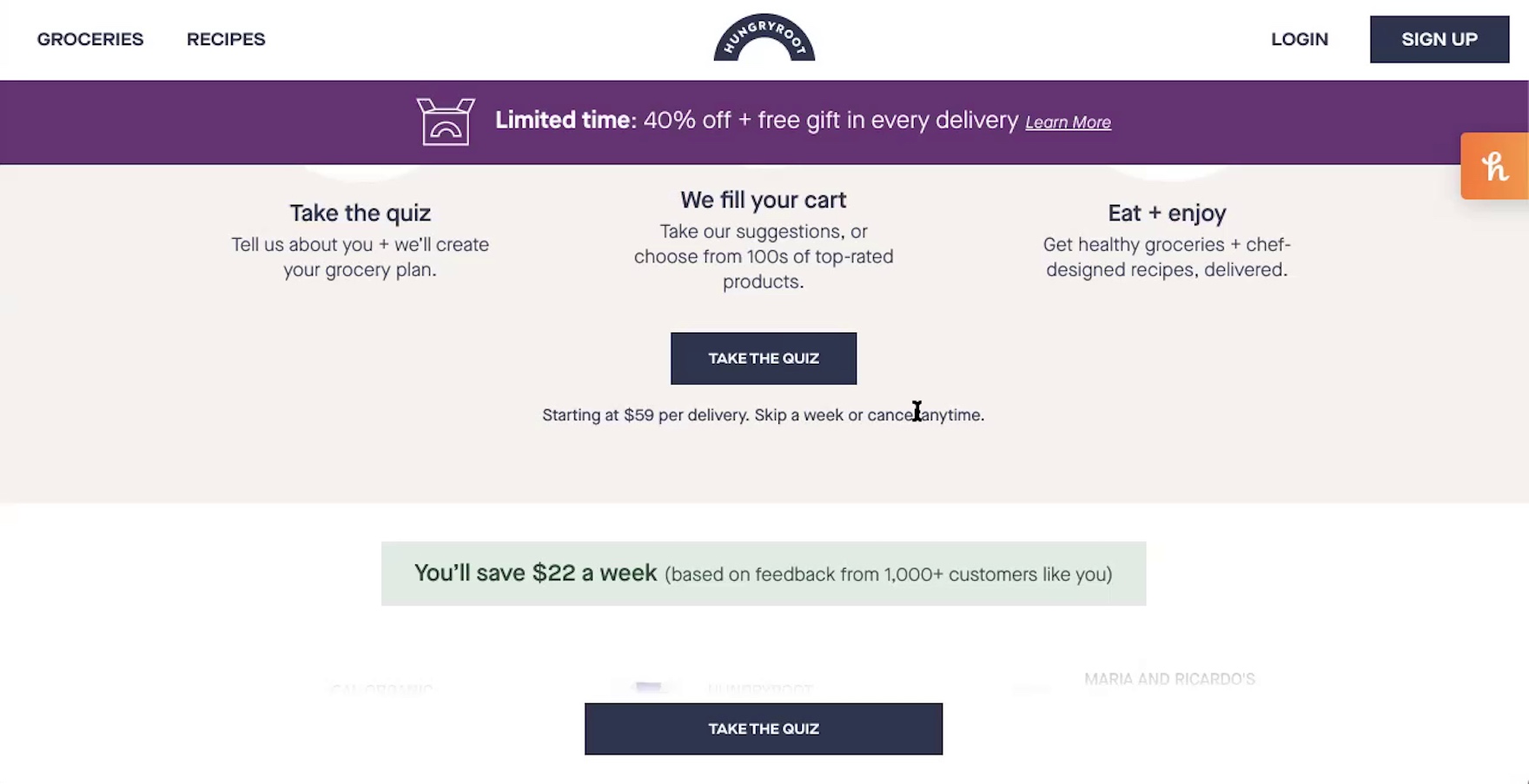 “But the one thing I still haven’t really gotten an understanding of is how much it actually costs.” At Hungryroot, multiple users missed the pricing information displayed on the homepage (“Starting at $59 per delivery”) on their initial scan of the page due to the text being inconspicuous.