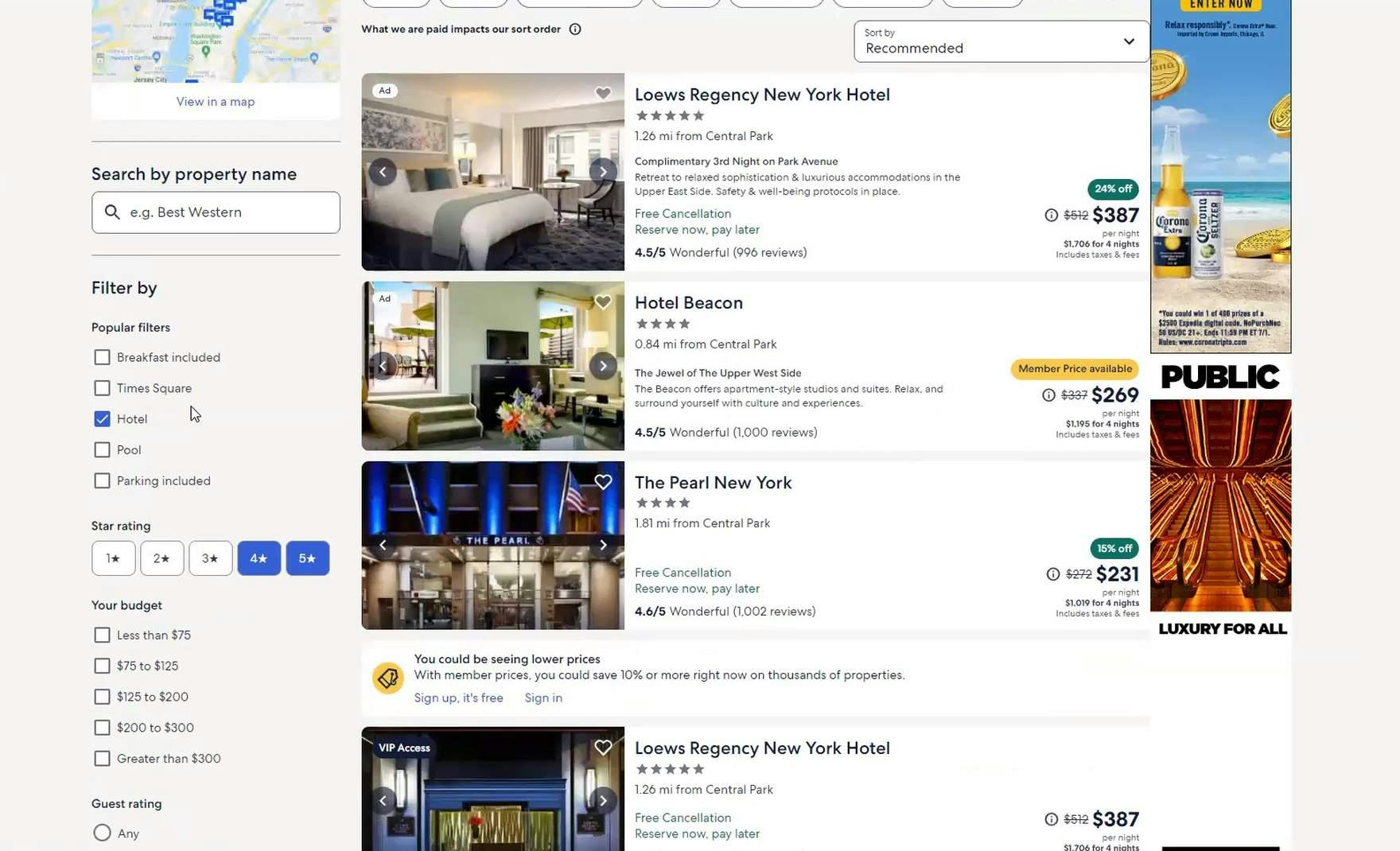 This is challenging when considering accommodations in large cities such as New York, where maps and lists of properties can quickly become cluttered and hard to navigate, distracting users from their goal of finding a property in a desired location.