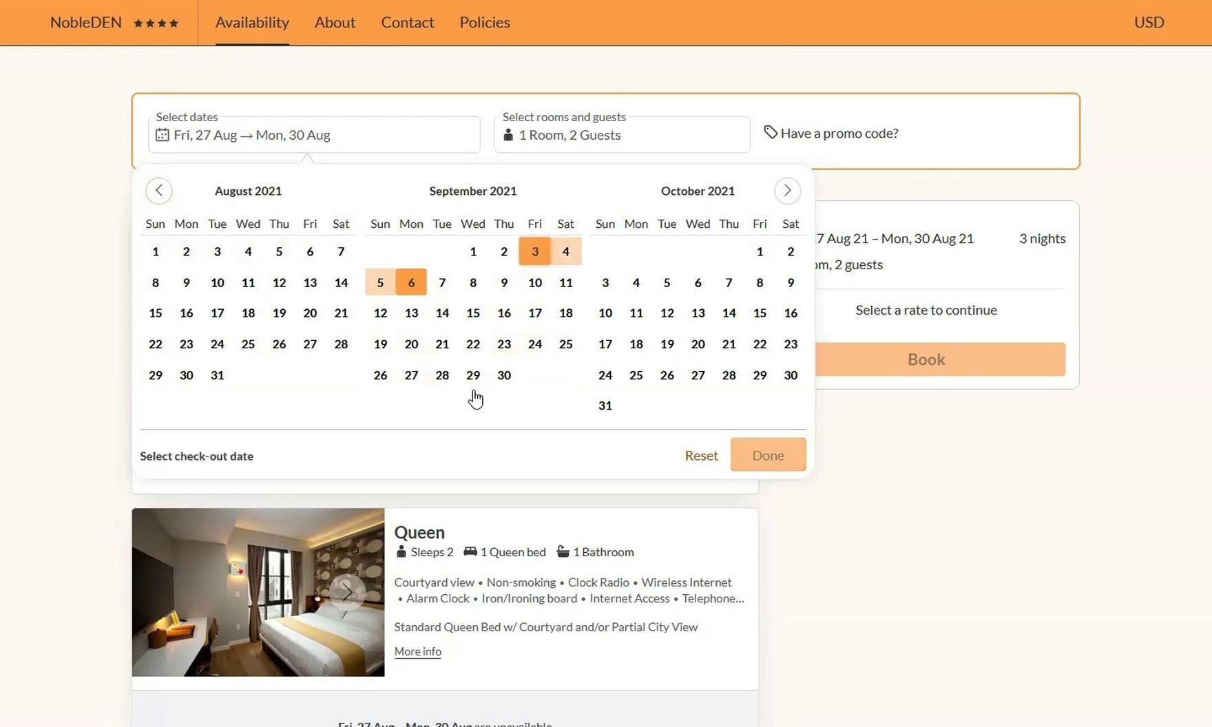 “I do like that it’s telling me the different price points based on the weekend or the day”, remarked a user as she viewed the calendar date picker in the “Booking” search feature on an individual hotel property details page at Expedia. Notably, unavailable dates — September 17–18 — are also clearly identified.
