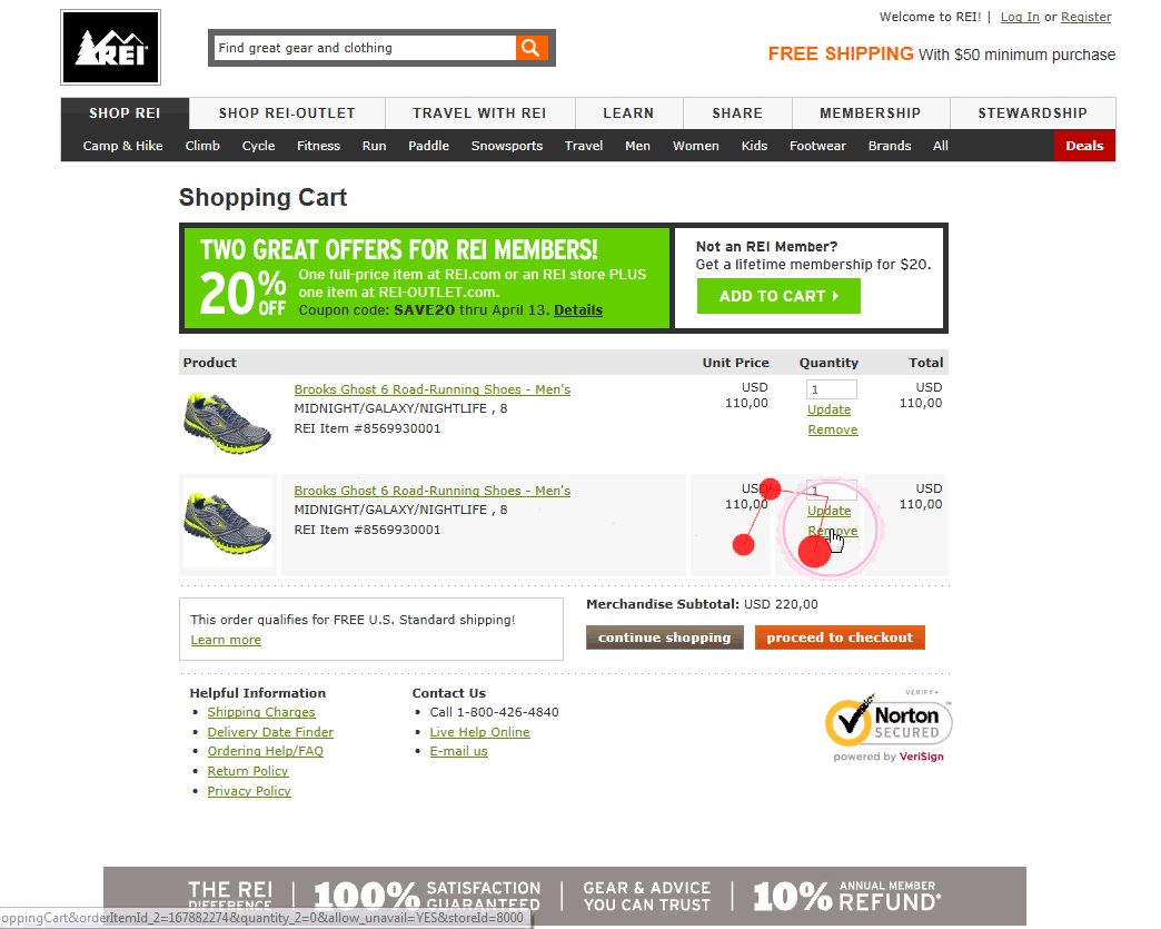 A user during testing at REI had accidentally placed two identical products in his cart. Only wanting one pair, he clicked the “Edit” link (first image), which sent him to the cart step (second image). As he deleted a pair and clicked the “proceed to checkout” button, he was sent to the first step in the checkout flow (third image) — a page he was already at six minutes earlier. “I think this is stupid, it starts all over again? Ha ha”, he laughed in despair, as he realized he would have to go through all of the checkout steps once more.