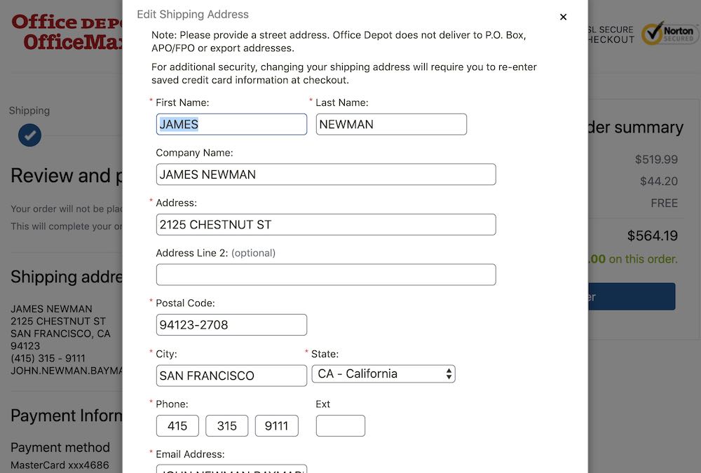 At Office Depot, users can edit their data directly at the “Order Review” step by clicking the “Change” button (first image), which opens an overlay (second image).