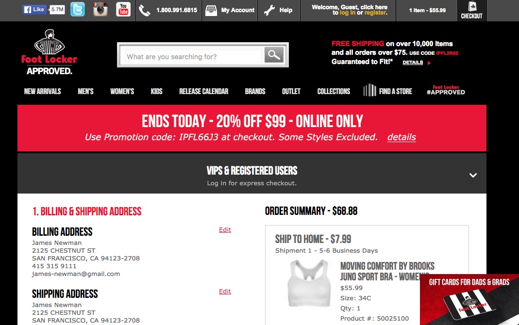 This is what users will be met with when landing at the “Order Review” step at Foot Locker. Note how around the first half of the available screen real estate consists entirely of non-order related content, such as menus and offers.