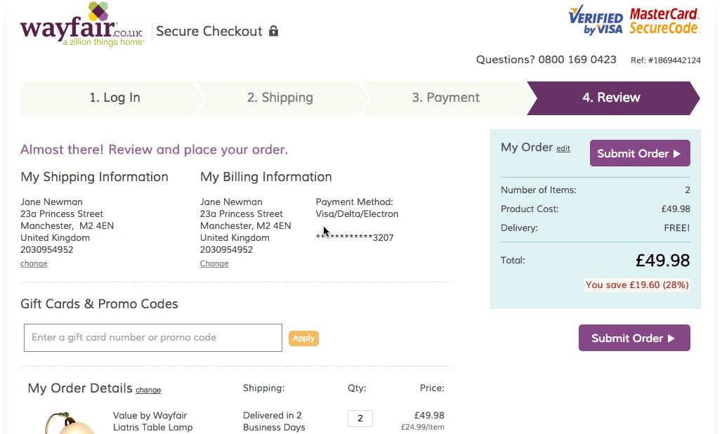 5) The card expiration date. Some users might have multiple stored cards of the same type (e.g., two VISA cards). To help users as much as possible it is therefore advisable to also display the expiration date for the applied card. The expiration date will resonate well with some, as the card that expires the latest will usually also be the newest card — for example, a user with two VISA cards will from the expiration date on the “Order Review” step often be able to tell if they are about to use “the old VISA card”.