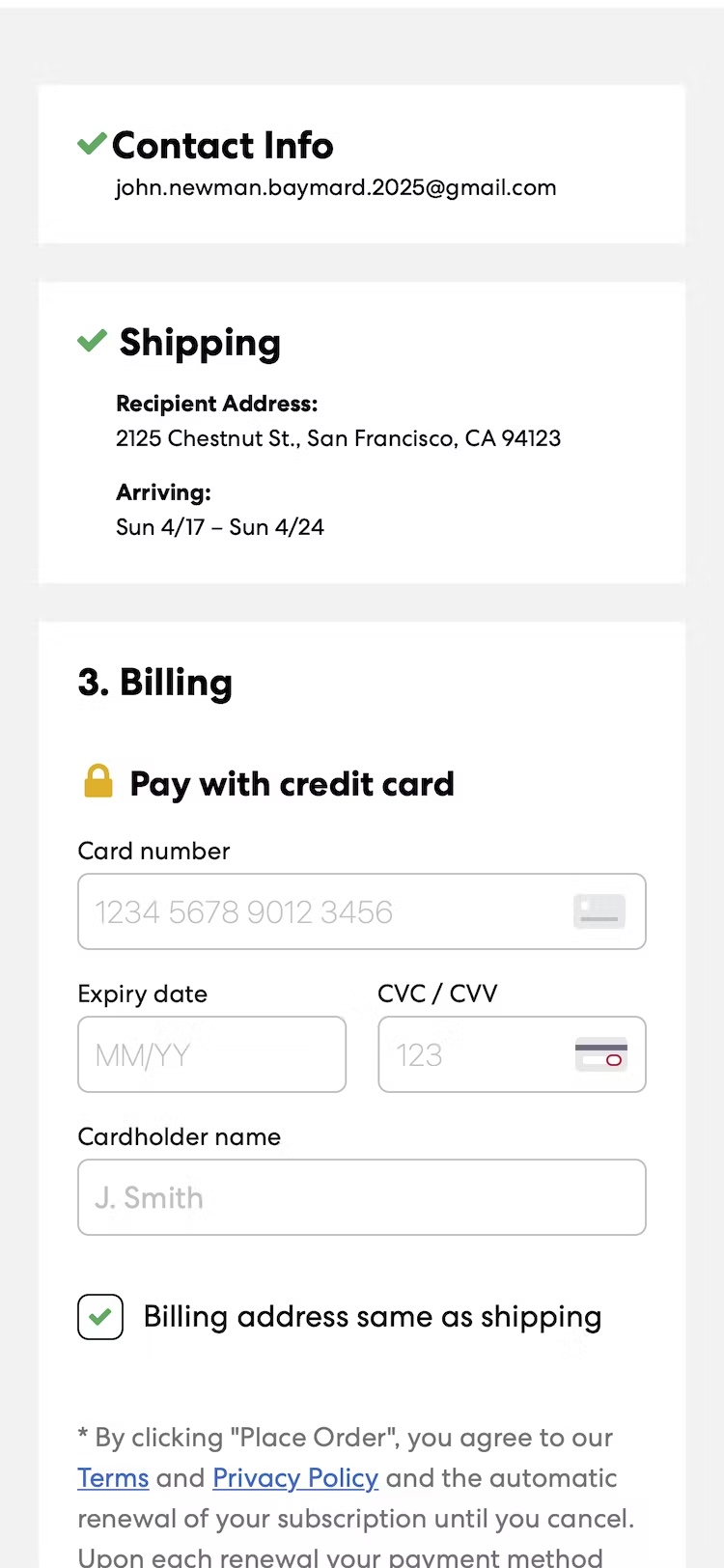 In testing, participants often hesitated to move forward with their desired third-party payment method when the button microcopy remained generic, ambiguous, or misleading — for example, continuing to read “Submit Order”, as it would for a credit card payment, when users would in fact be directed to Paypal.