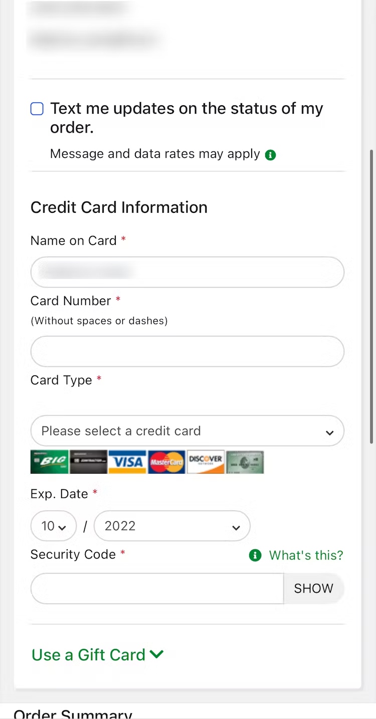 During testing at Williams Sonoma, the popular “Credit Card” option was selected by default, allowing users to immediately begin inputting their credit card details without needing to manually select the option first.