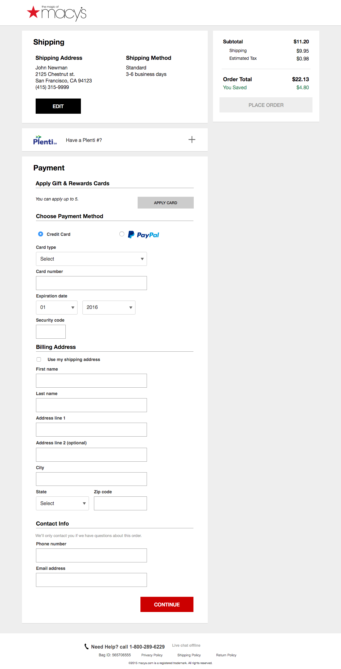 The test subjects generally had less confidence in the security of their credit card details on pages where the credit card form didn’t “look” or “feel” more secure than the rest of the form fields used for less sensitive information. An example of Macy’s is seen here – notice how the credit card fields and address fields look exactly the same.