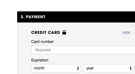 It’s important to note that the visual reinforcement must be distinct and unique for the credit card fields. If you use a similar style elsewhere during your checkout form for less sensitive information, it will likely be considered generic styling and not yield the desired increase in user confidence. Again, this is about tapping into the user’s perception of the fields, making the user feel that this highly sensitive information will be treated more securely than the fields that contain less sensitive information (like an address or name).