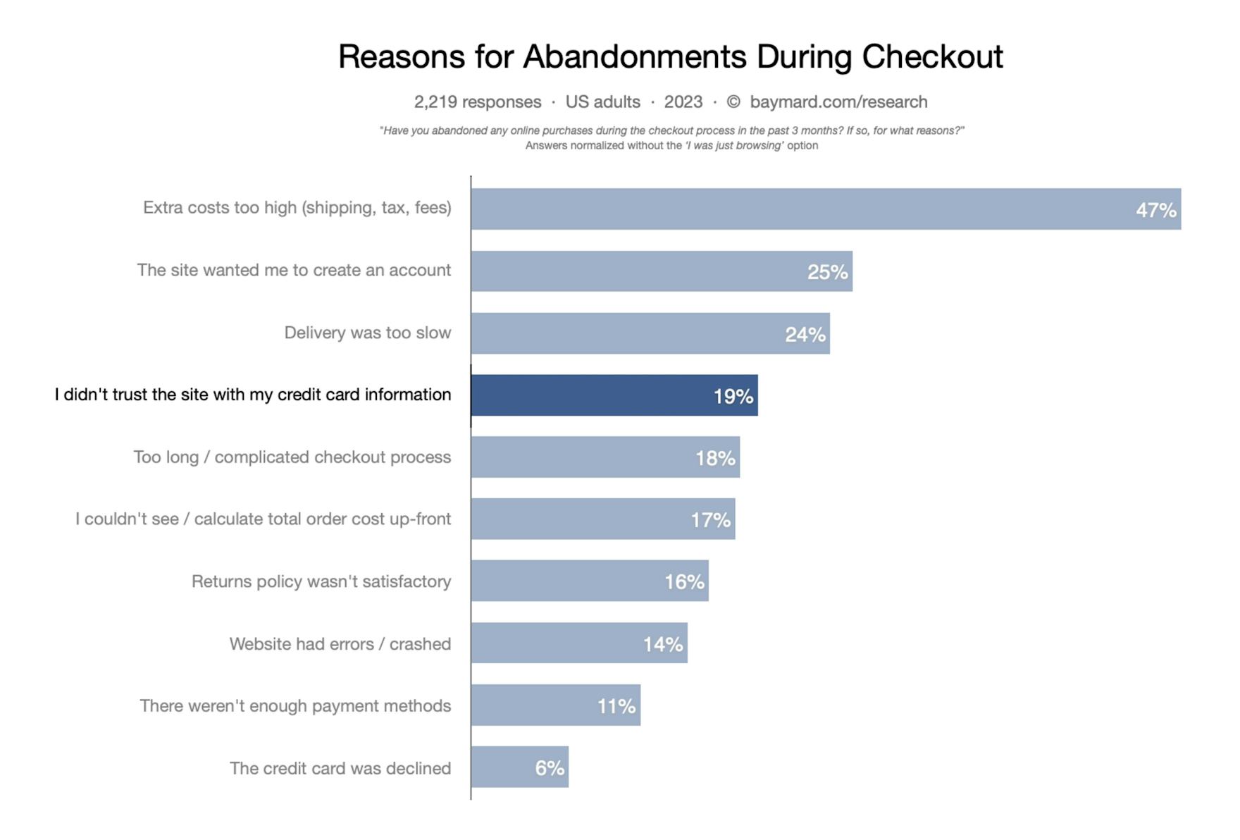 In fact, our most recent Checkout Usability study reveals that 19% of users have abandoned a checkout flow during the last 3 months because they “didn’t trust the site with their credit card information” (2,219 respondents, average US adult internet population, 2023). Throughout all of our testing of checkout processes, we’ve consistently observed 2 important user behaviors relating to security: