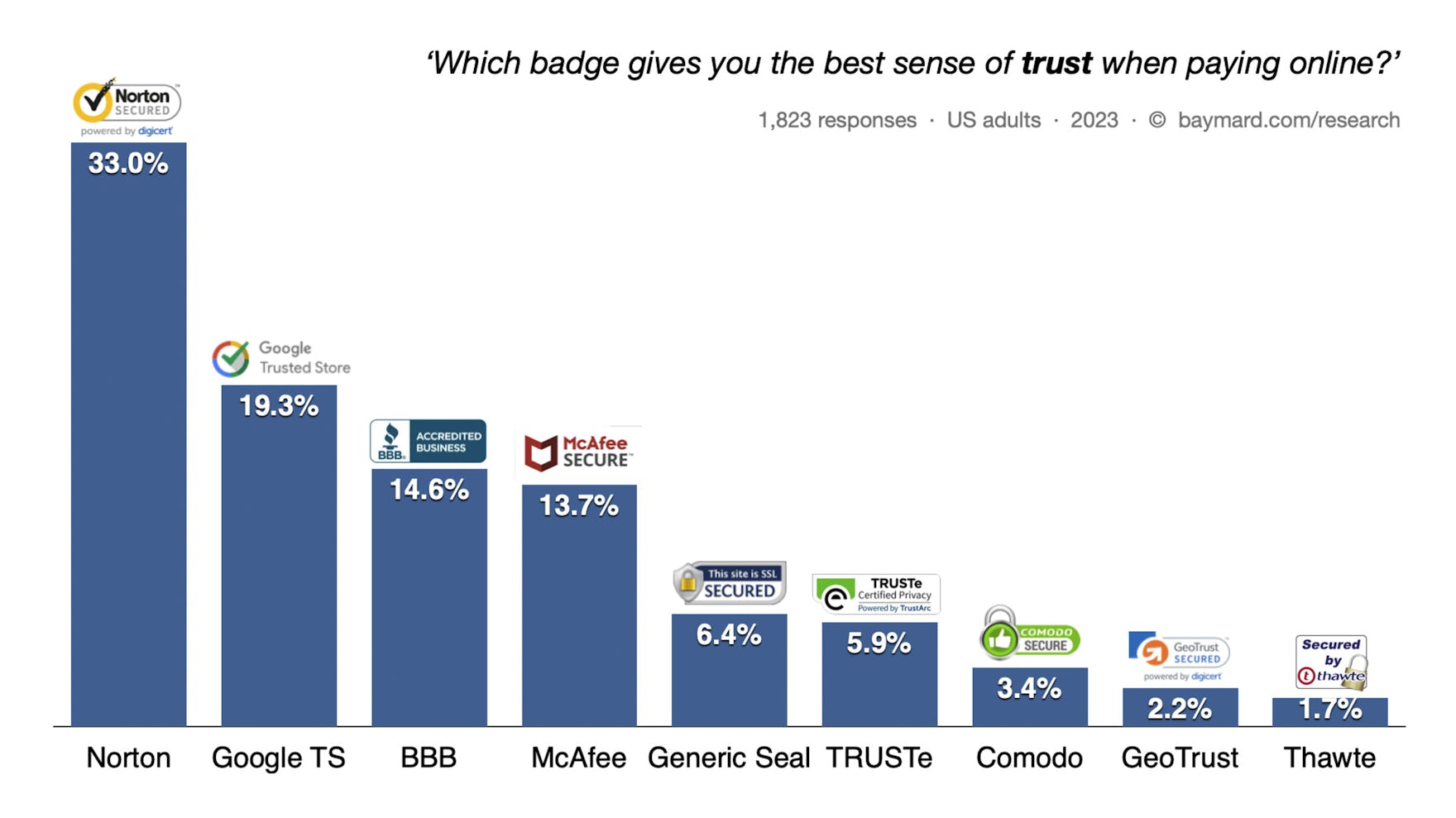 The 2023 test results tell largely the same story as our previous results. The SSL seal from Norton dominates as the seal that establishes the best sense of trust, followed by three trust seals, with several of the SSL seals performing rather low. Looking at the results, it’s very interesting to note that the seals from well-known consumer-facing brands, like Norton and Google, perform very well (even though Google no longer uses the ‘Trusted Store’ seal). This suggests that it’s at least to some extent possible for e-commerce sites to leverage the recognizability of these brands.