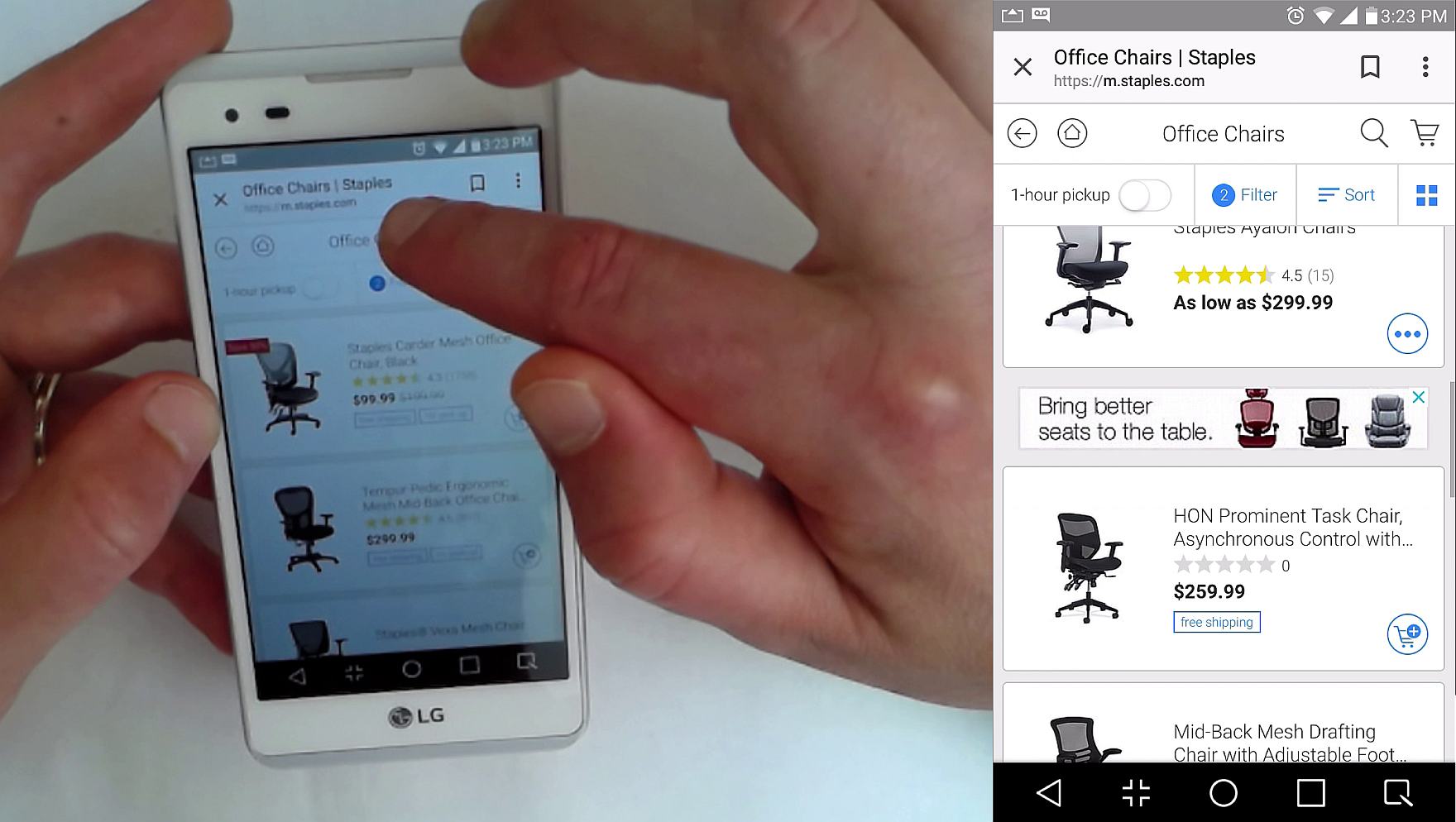 2. Make it easy to activate the search field. Test users wishing to revise their search queries at Staples tapped multiple times in an attempt to activate persisted query text in what looks like a search field. After numerous taps — in one case, also with accidental text selection — and several seconds passing, these users eventually realized that tapping the magnifying glass icon is the only way to activate the search field in order to edit their query text. Failing to offer an easy-to-activate search field causes users needless hesitation in their attempts to modify persisted query text.