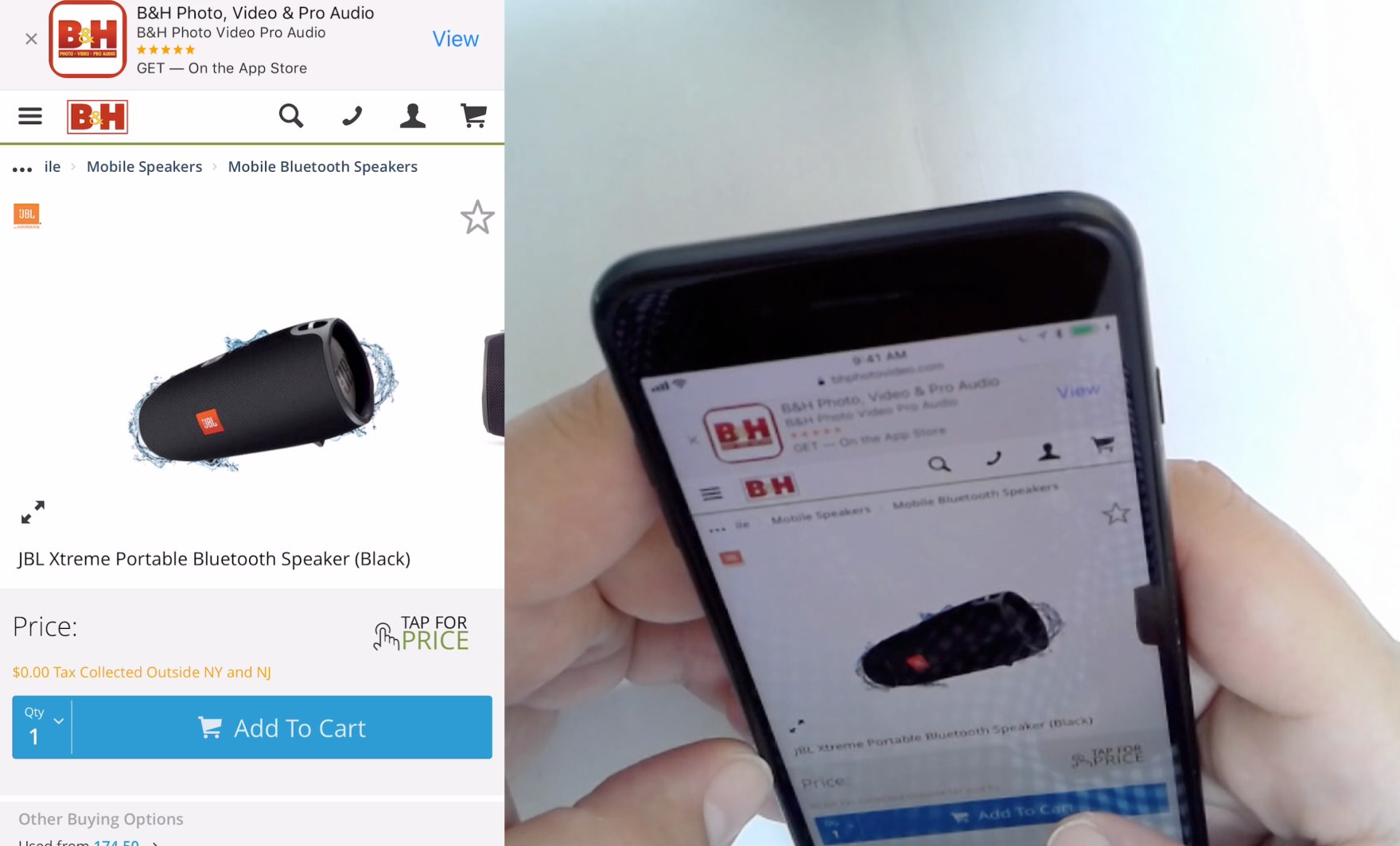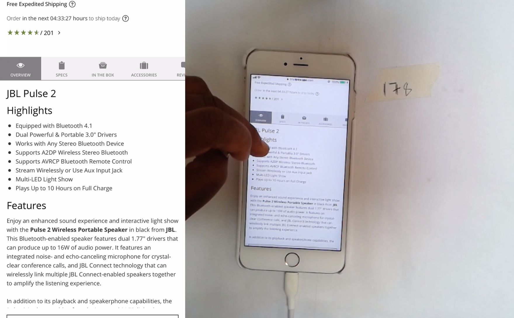 “I wanted to see if it was waterproof…and it said ‘Don’t submerge it’. Which I thought was helpful to know.” The image for a Bluetooth speaker on B&H Photo displayed the product being splashed by water (first image). This evocative image, which illustrated a key feature of the product, prompted the user to investigate the product description so they could discover more information about this particular feature (second image). The product description for the speaker explained what was hinted at in the graphic in greater detail using plain language. Potentially ambiguous graphics included in product images should be explained in the product description.