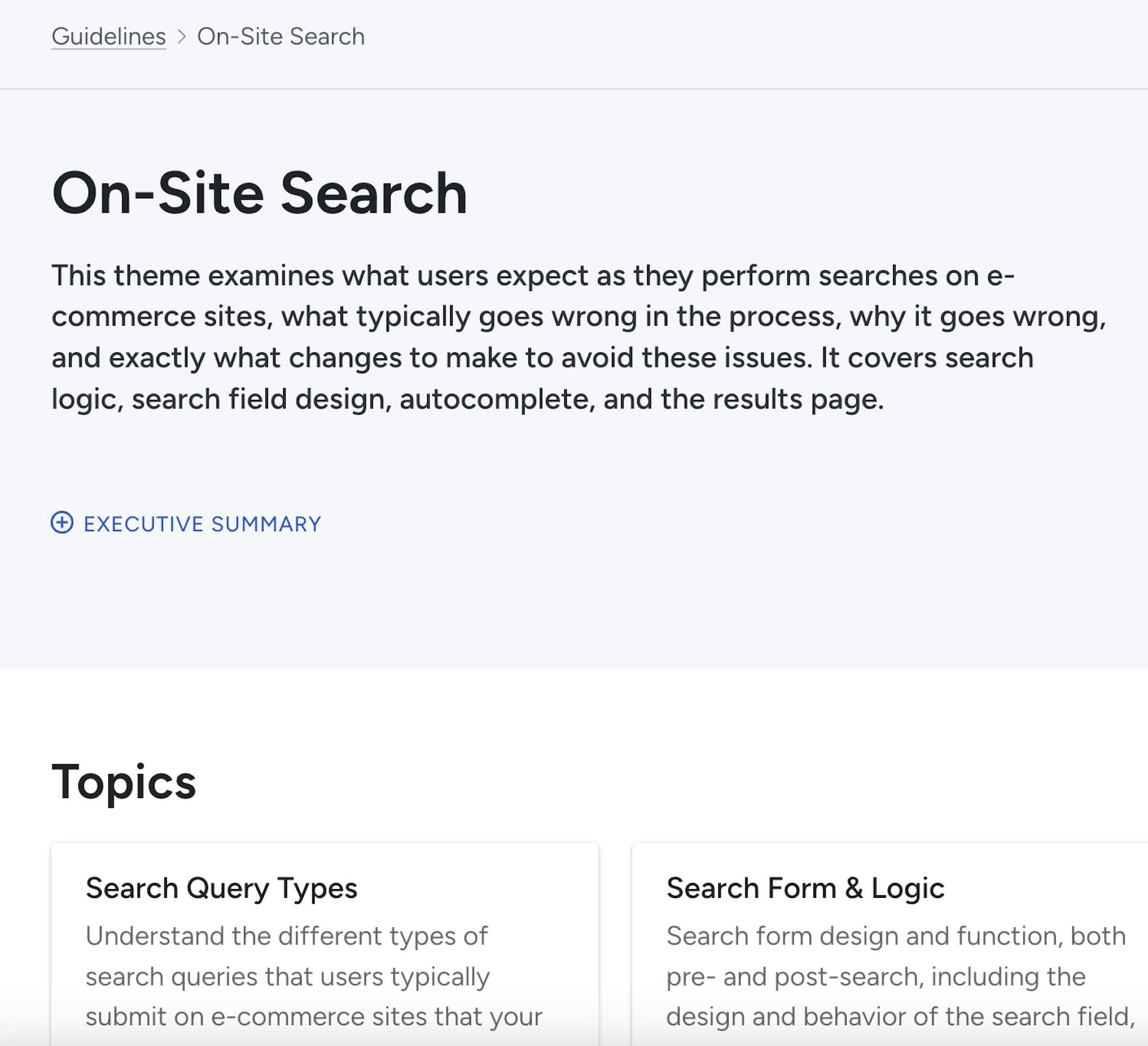 The 160+ guidelines cover most aspects of the Product Finding UX, at both a high level of general user behavior as well as at a more granular level of specific issues users are likely to encounter.