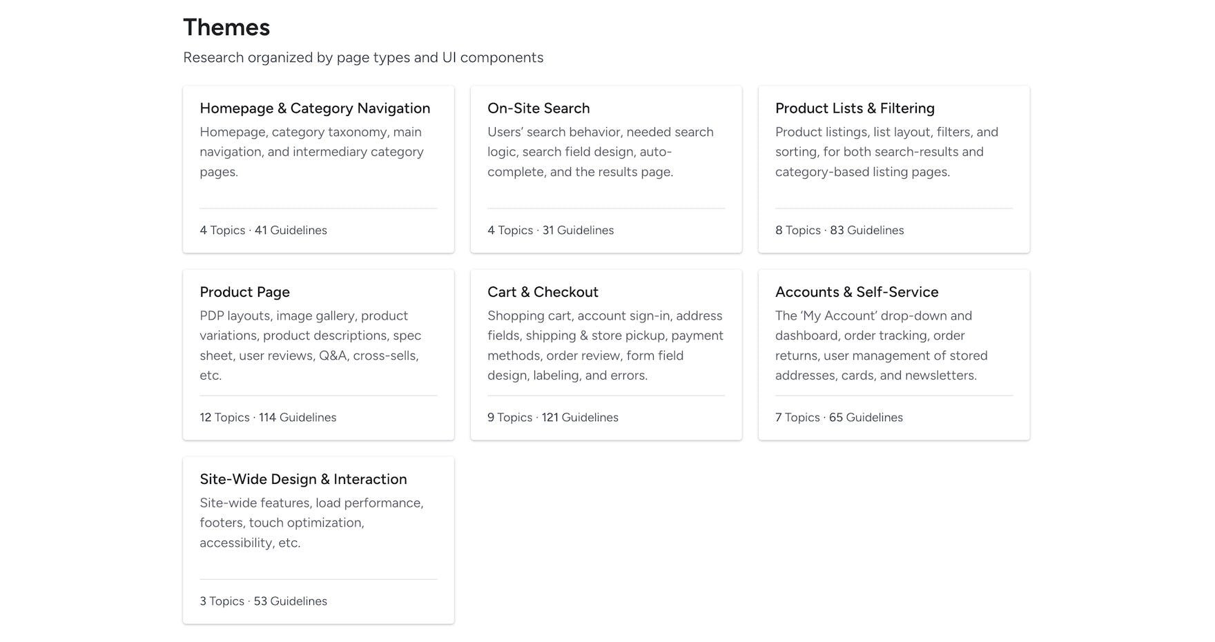 Our latest round of large-scale product-finding research reverified guidelines in 3 Premium e-commerce themes: Homepage and Category Navigation, On-Site Search, and Product Lists and Filtering.