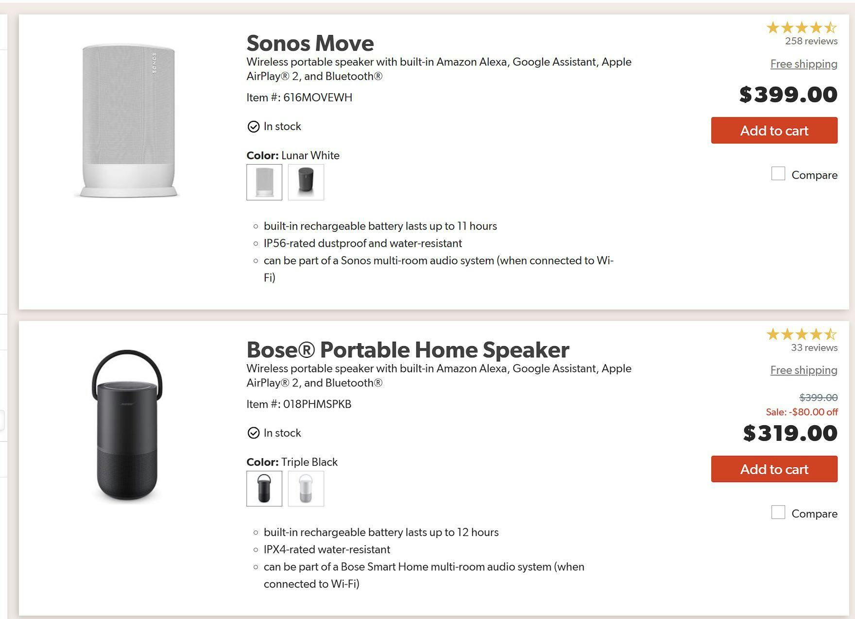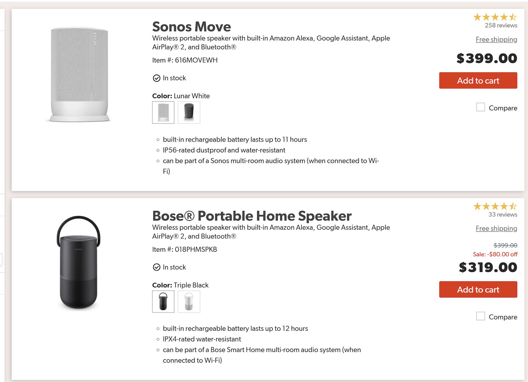 List items in the “Portable Bluetooth Speakers” category on Crutchfield include the level of water resistance, such as “IPX4-rated water-resistant”. For products designed to be used outdoors, this attribute is important, and users can judge suitability right from the product list.