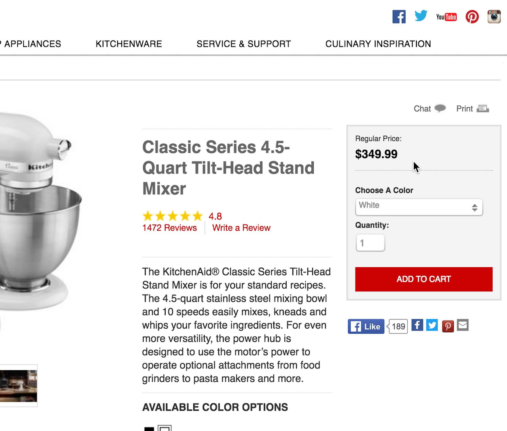 “You have the cost right here.” At KitchenAid, test participants easily found the price within the “Buy” section at the top of the PDP. The use of bold, lack of competing elements, and prominent placement help to draw users’ attention.