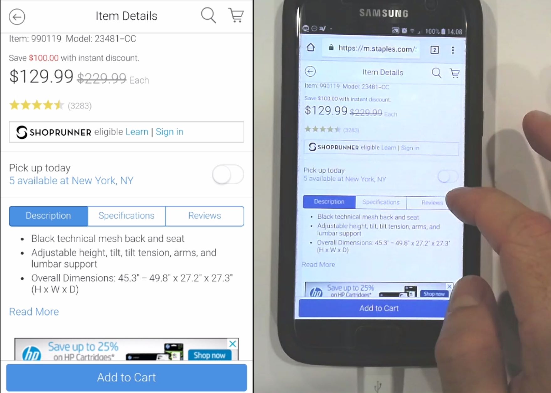 “I like the fact that…there’s a discount.” This participant appreciated the prominent discount pricing highlighting “Save $100.00 with instant discount” on Staples’s mobile site. In this instance, displaying “Save $100” likely has a stronger psychological effect than the same discount presented as a percentage (“Save 43%”).