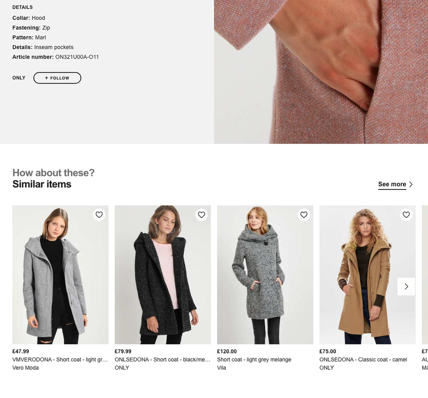 Zalando includes large high-quality thumbnails for alternative cross-sell recommendations to ensure users can visually assess the similarities and differences.