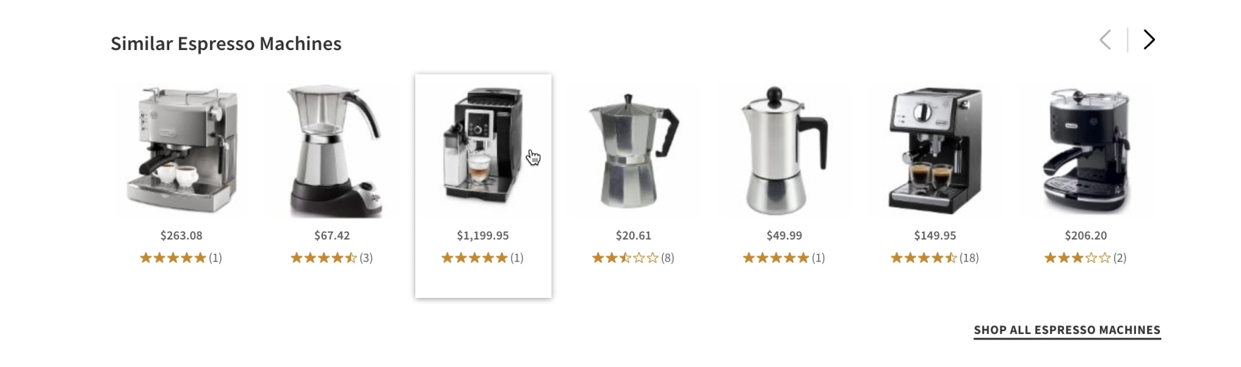 At Macy’s, users can easily factor the user ratings averages of the alternative product recommendations while comparing to the current item.