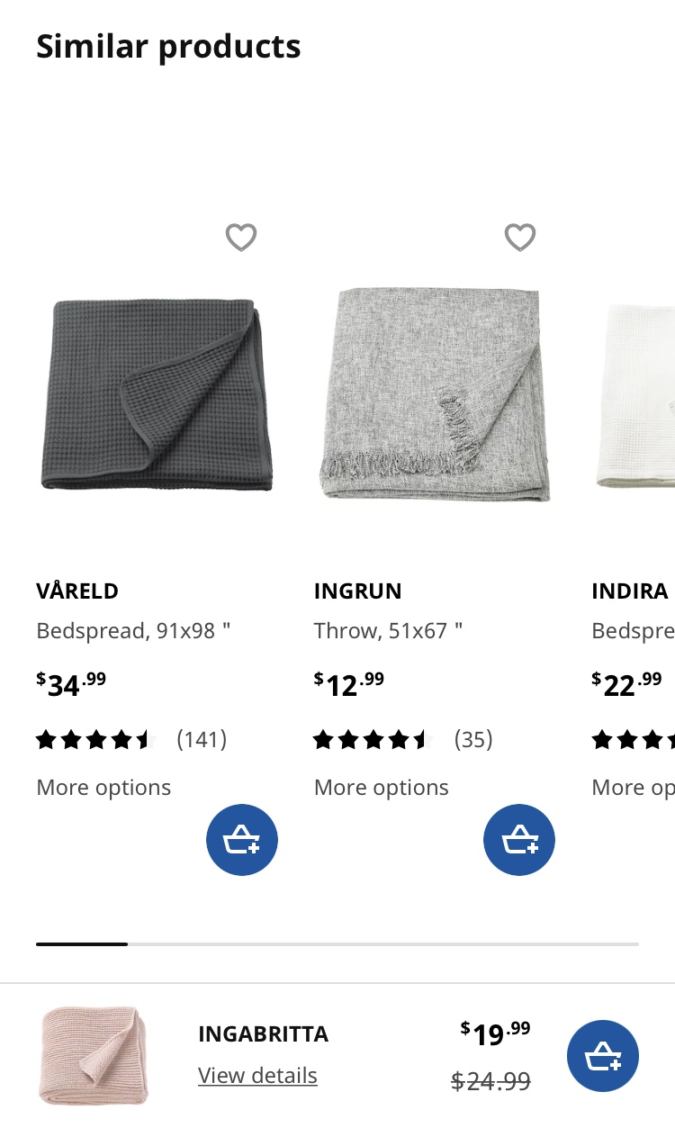 Product variations are available in the “Similar Products” cross-sells section at IKEA by clicking on the “More Options” text (first image). This serves to reassure a user who is interested in the first alternative, for example, but not necessarily the dark-gray color shown in the thumbnail image, that exploring the alternative product recommendation will be worth the tap (second image).