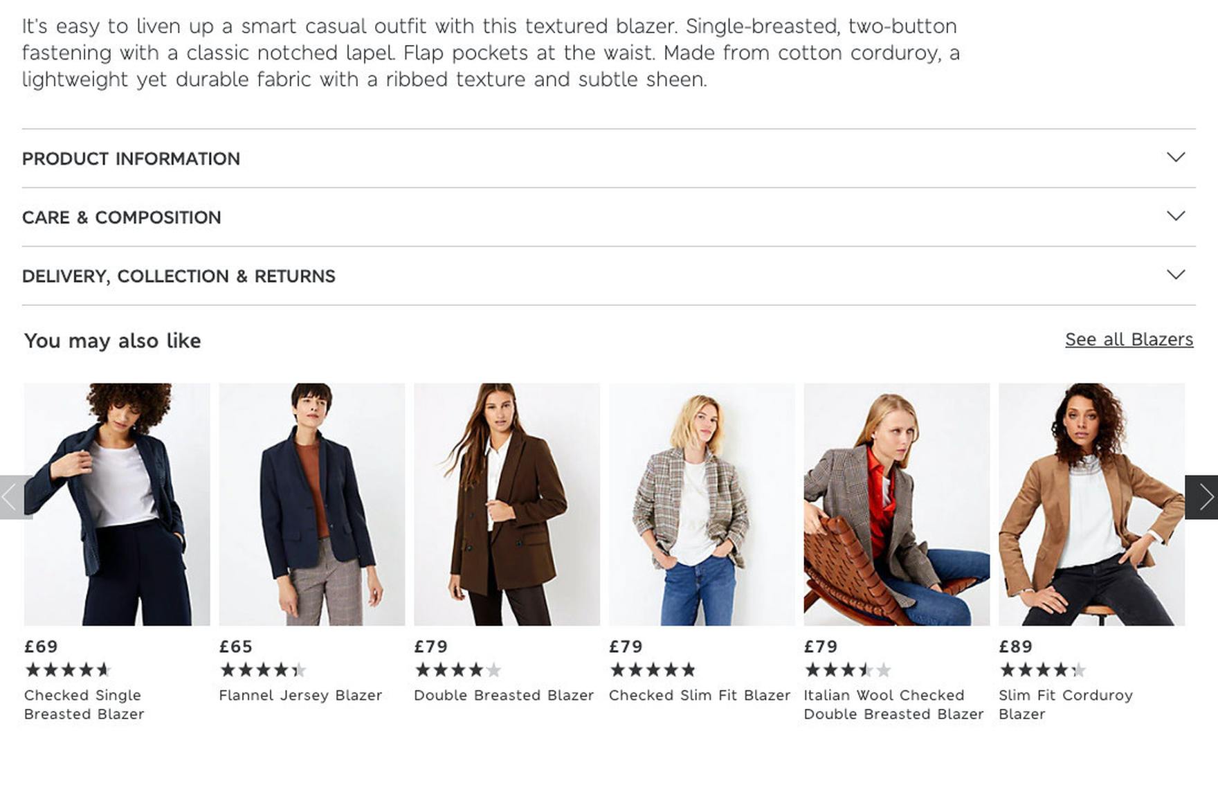 The absence of brand name in the “You May Also Like” and “Wear It With” cross-sells sections at Marks & Spencer means brand-conscious users will overlook product recommendations from their preferred brands that they’d otherwise potentially be interested in.