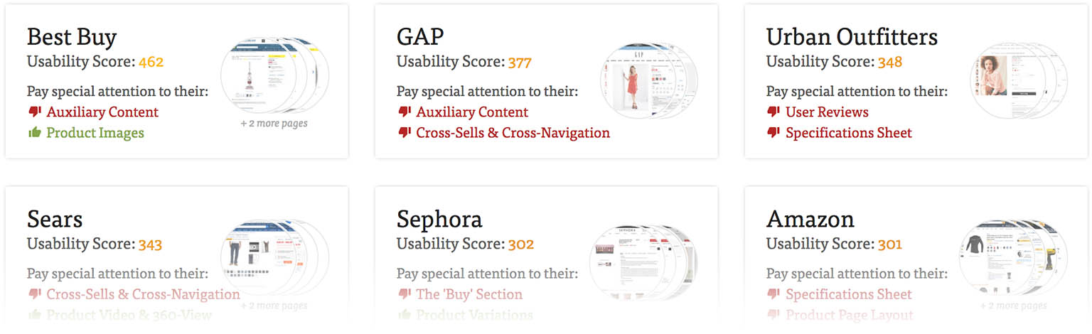 In addition to the Product Page report, the study also includes unrestricted access to the Product Page UX benchmark database. The benchmark reviews and compares the product page experience and performance of 60 major US and European e-commerce sites across each of the 98 guidelines presented in the 621-page report. This provides you with an additional 4,100 categorized and performance-verified best-practice implementation examples, and more than 5,700 product page UX performance scores, identifying which sites and competitors offer their users a superior product page experience, and why that is.