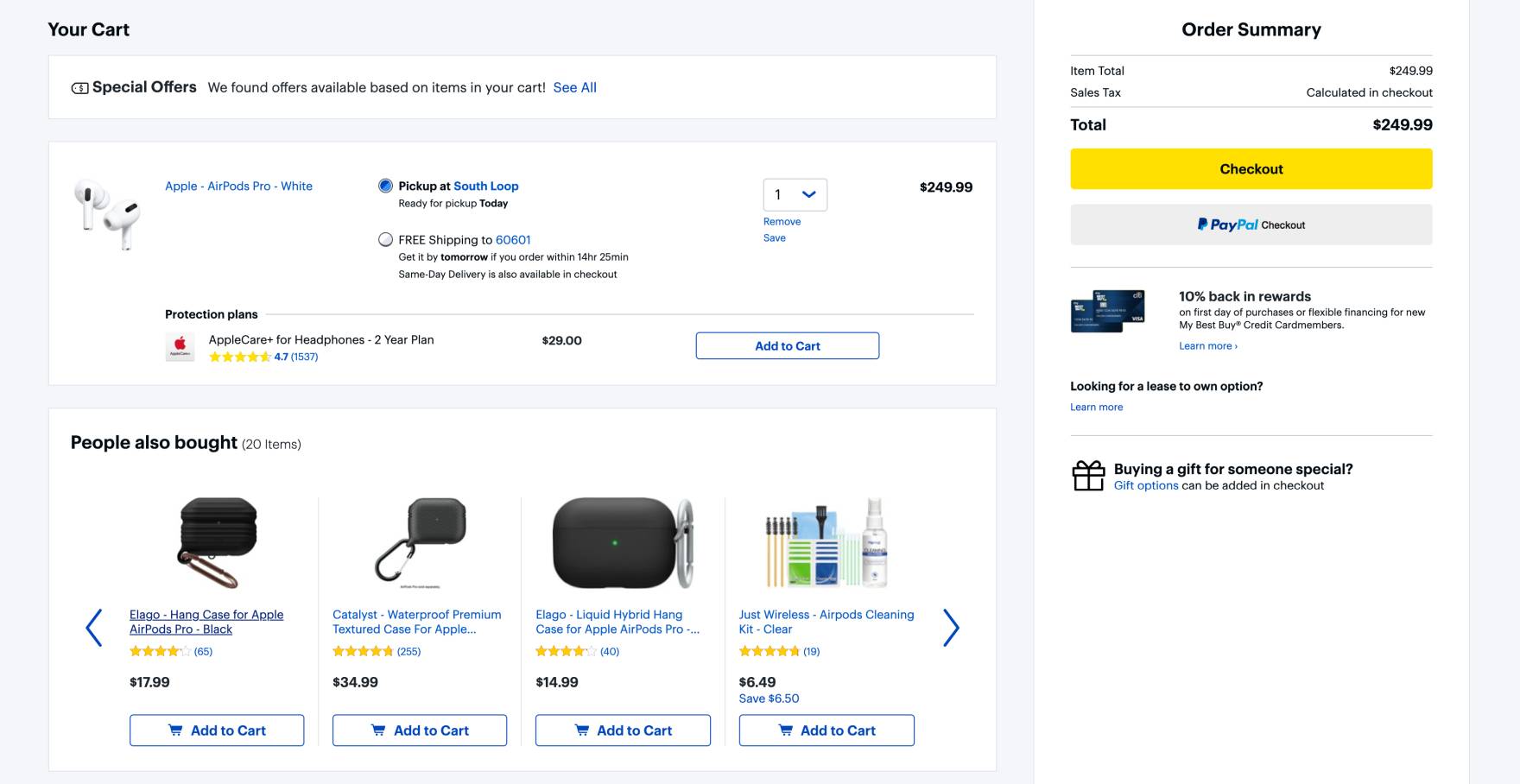 Best Buy recommends a variety of relevant accessories in the cart that others have purchased along with Apple Airpods Pro, including alternative cases and a cleaning kit.