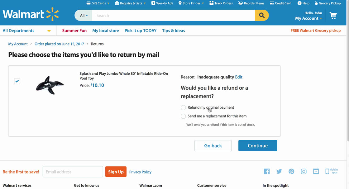 “I would not want the same size, so, I’ll just take my money back”. A user at Walmart was returning a toy because it was too small. Unable to find out how to easily exchange the product through the online return flow, he elected to just get a refund. Users who are able to use the in-store return option would often find it much easier to exchange a product.