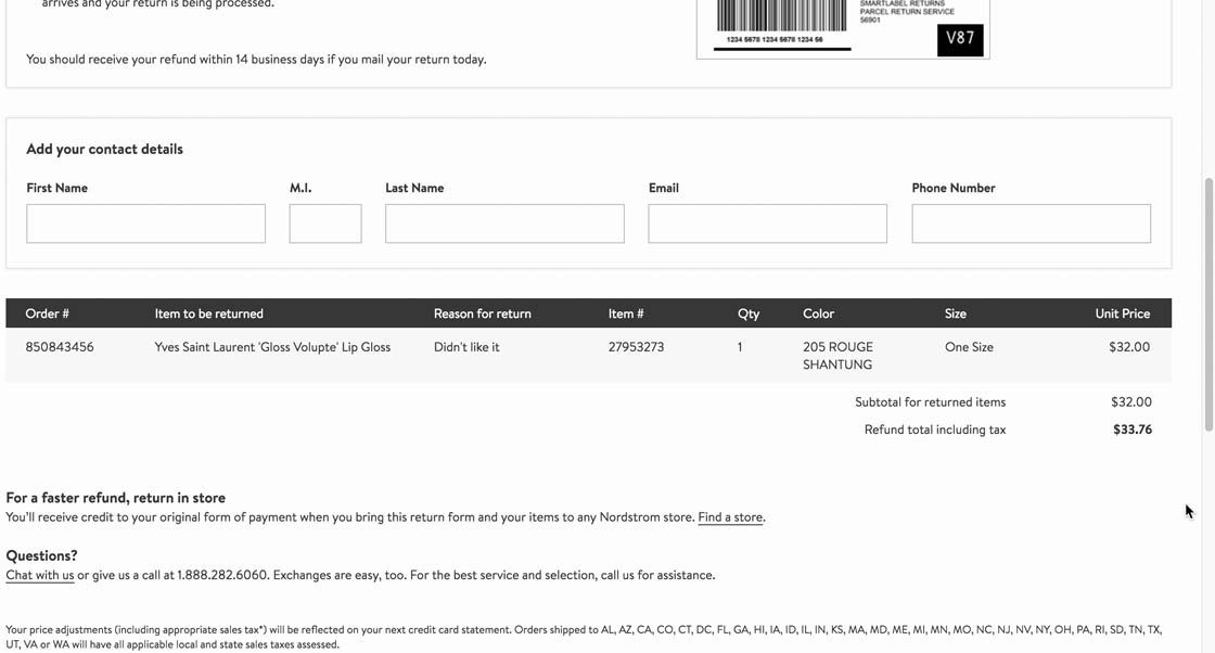 At Nordstrom, the information on returning products in store in the return flow is secondary to the return shipping option, making it much more difficult to find.