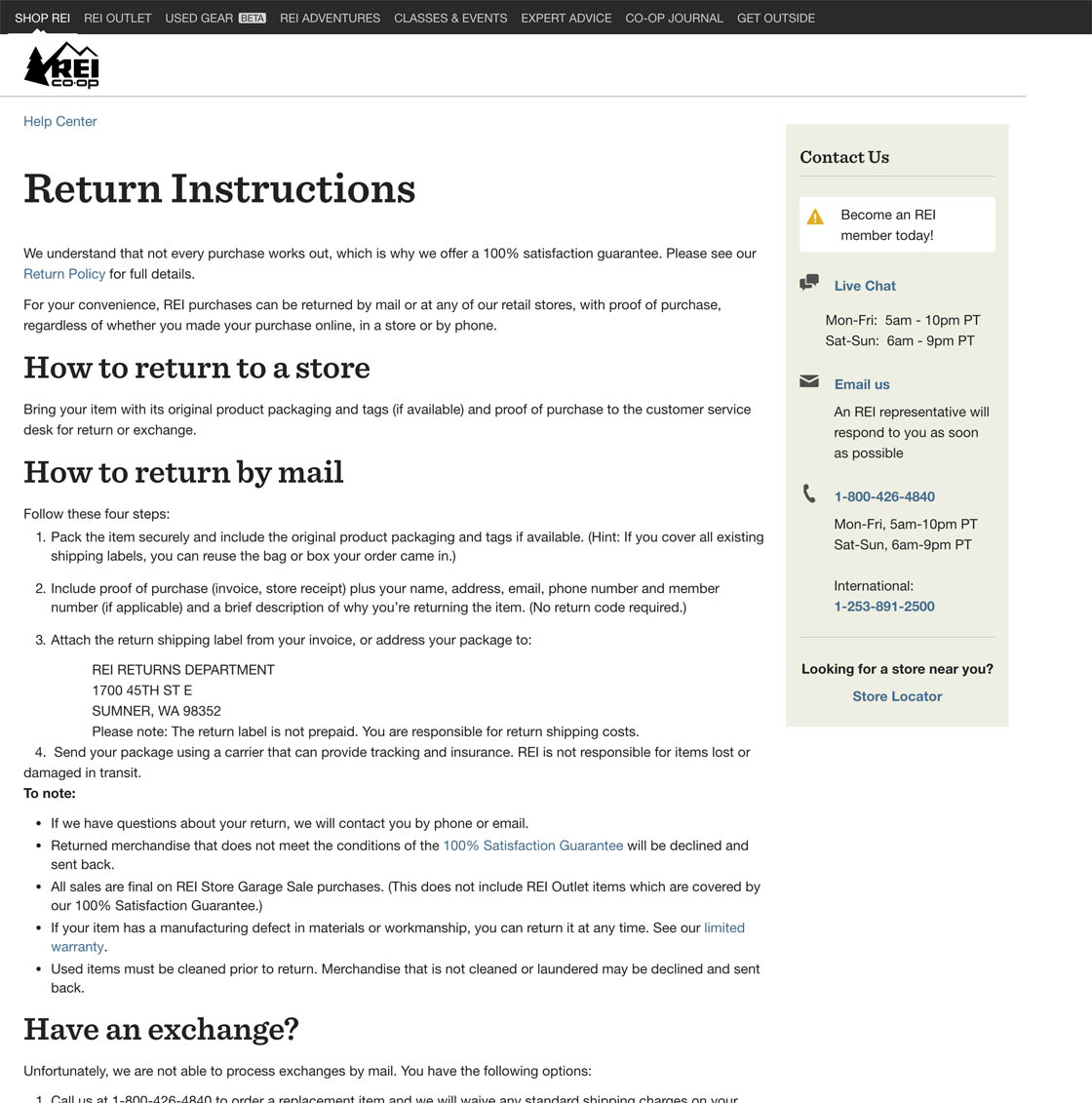 REI provides information on in-store returns alongside information on returning by mail in the help section, making it easy for users to discover that in-store returns are an option.