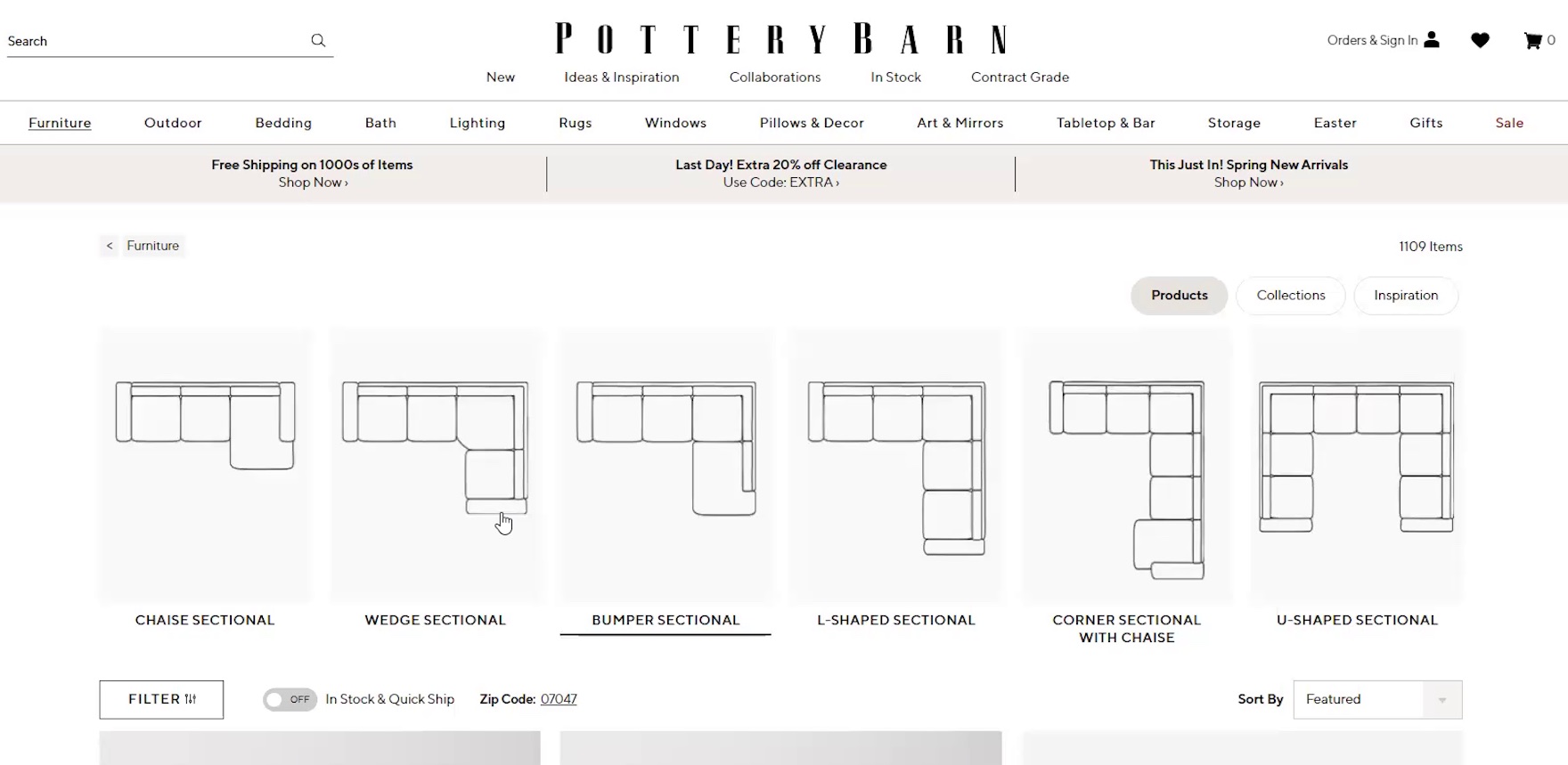 “I guess it depends on if I want an arm seat or a ‘Bumper Sectional’. I guess I’ll look at the bigger one to start…or ‘L-shaped’, let’s do ‘L-Shaped’…Okay so these, it doesn’t look like it has that storage underneath. So I’m probably going to go back to [‘Bumper Sectional’].” Shopping for sofas on Pottery Barn, this test participant made use of the promoted filters that allowed users to specify a particular shape before she scrolled the list or considered other filters. When carefully chosen promoted filters can be very helpful, especially when there are visuals depicting each filter option.