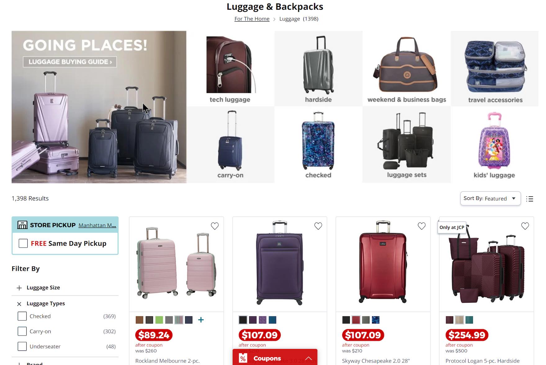 Note how the promoted filters for “Luggage Types” remain in the filtering sidebar on J.C. Penney. Users will be able to find filters where they normally expect them to be in the sidebar if they overlook the area where they are promoted.