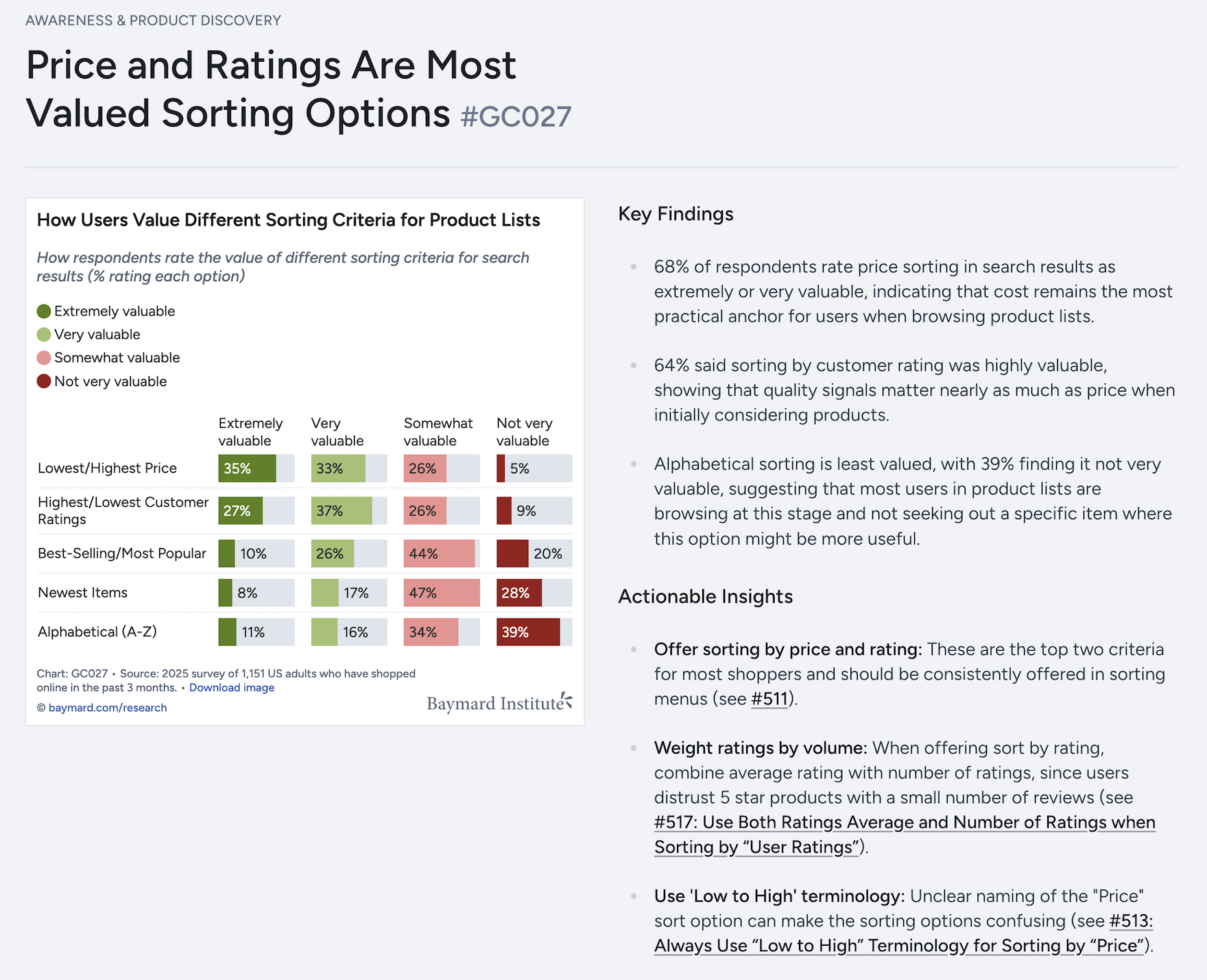Baymard’s Quantitative Insights can help align stakeholders, guide smarter A/B testing, and reveal new UX opportunities backed by large-scale survey data. Many Quantitative Insights include “Actionable Insights” offering guidance on how to apply these insights directly to your own UX work.