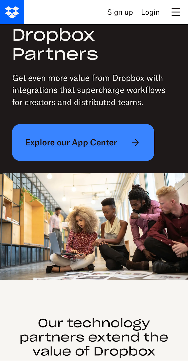 Here, Dropbox features its user experience with application screenshots while also guiding prospective customers to specific use cases to start their journey.