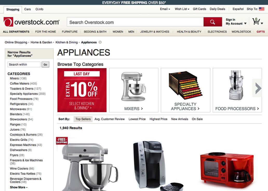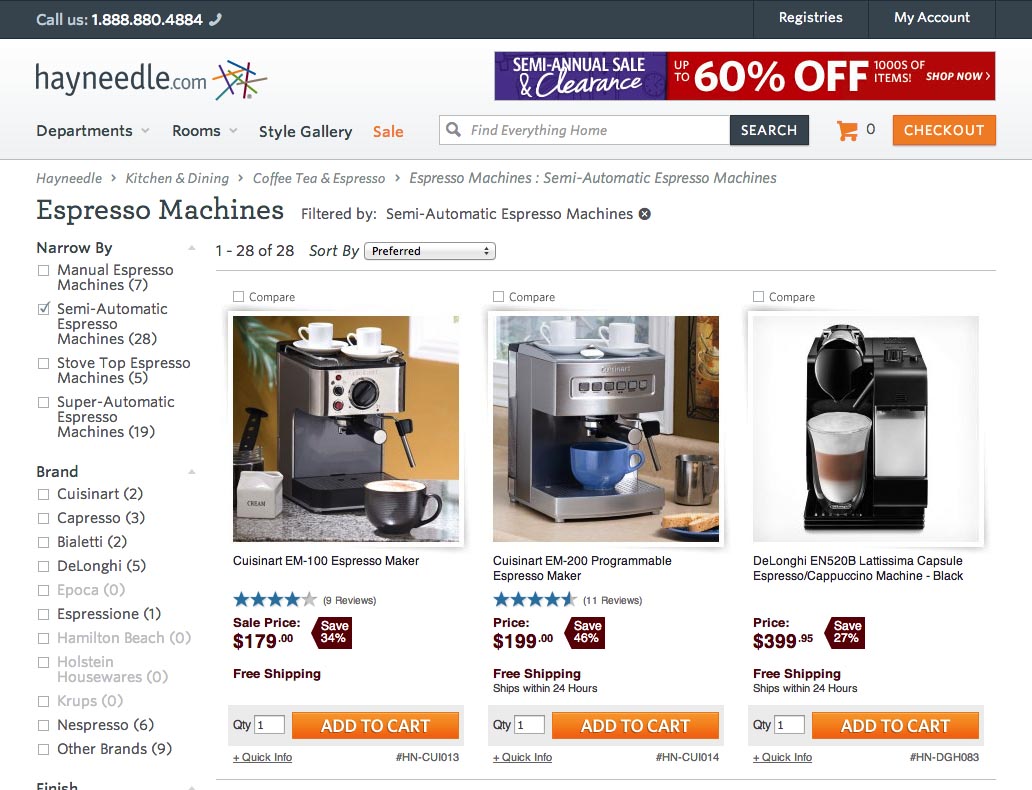 Hayneedle’s search field stands out a little more but with no clear preference between search and category browsing – they are equally prominent on the page. This is likely a function of some users knowing exactly the item they want (search preference) while others just know the type of product they are interested in and want to browse Hayneedle’s catalog first (category navigation preference).