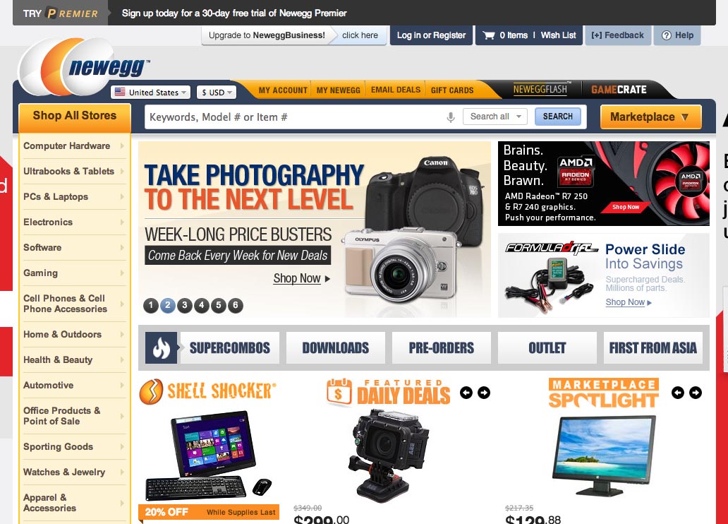 Newegg offers up an example of a more dominating search field that nudge users towards adopting search as their primary product finding strategy. Given the size of Newegg’s product catalog and the type of products they carry, this seems a sensible design choice.