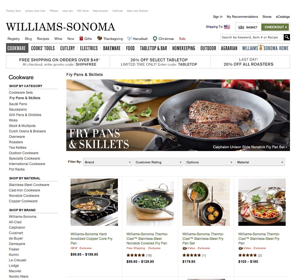 1) Position: A less prominent appearance can be achieved by placing the search field above the main navigation menu, as seen here at Williams-Sonoma with the search field located in the upper right corner of the header.