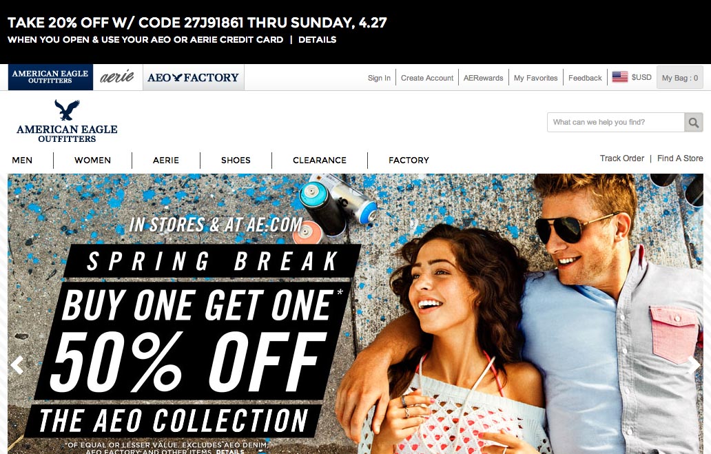 2) Contrast: The graphics of the search input field consist of many sub-elements such as the field’s border and background color, input font and size, placeholder font and size, etc. The more these sub-elements, as a whole, blend into the header, the more subdued the appearance – as is evident in this example from American Eagle Outfitters.