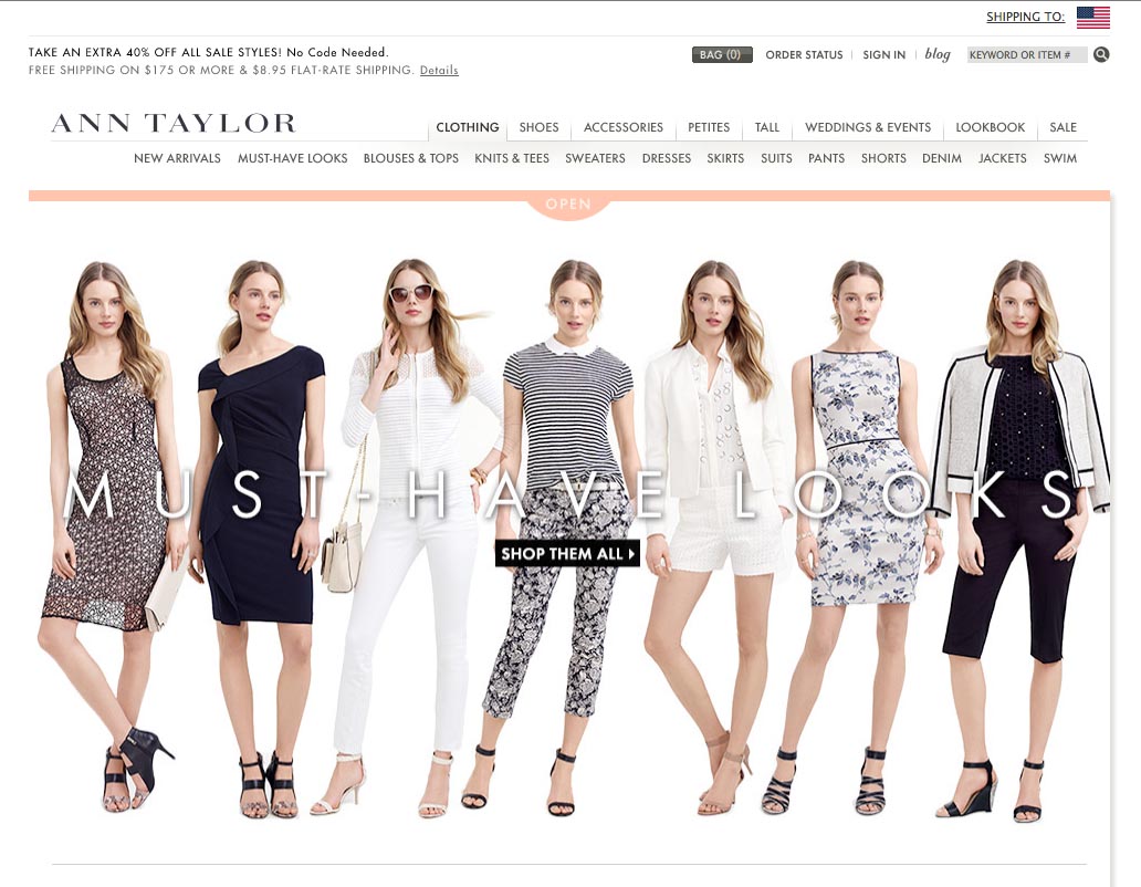 3) Size: By making the search field physically small, its visual prominence is greatly lowered, as seen here on Ann Taylor. This sends a strong signal to the user that category navigation is the preferred product finding strategy for this site.