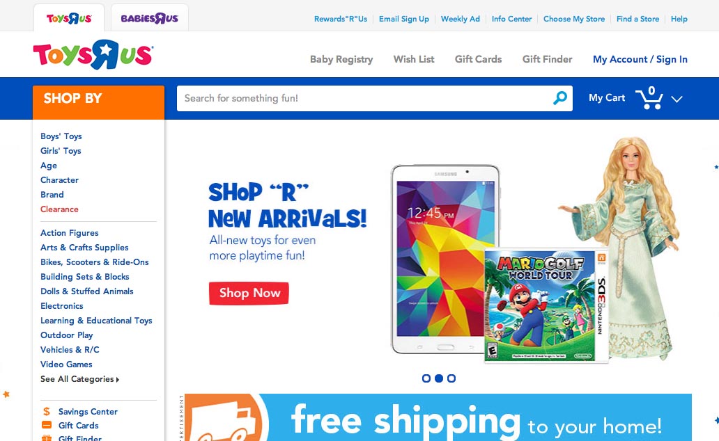 3) Size: Toys’R’Us boasts one of the largest search fields among the top 50 US e-commerce sites. The search field stretches 60% of the 950-pixel-wide header layout. A field this wide yells “search” to the point that it’s likely that some users will interpret this as Toys’R’Us implying that search is the only viable product finding strategy on their site (essentially communicating “don’t use categories”).