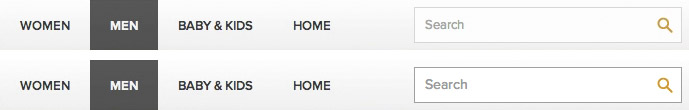 - Contrast – The search field’s contrast may similarly be tweaked to increase or decrease the field prominence relative to other elements on the page. Increasing the contrast of the field’s border, input text, search button, etc. can make it pop out on the page, while subduing these elements can allow the field to recede into the overall page design, allowing other elements to draw the user’s attention.